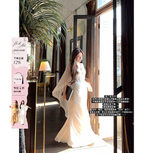 安妮不火银戒吻痕气质鱼骨雪纺女神拖尾裙女新款微胖大码半透视裙