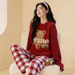 2026新年红可爱小熊半边绒睡衣女冬季条纹加绒加厚珊瑚绒家居服1