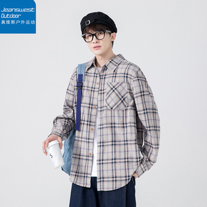 真维斯户外运动美式复古磨毛格子长袖衬衫百搭宽松寸衣情侣款外套