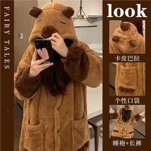 卡皮巴拉睡袍居冬爱季珊瑚绒浴袍卡女通GWT睡衣厚可宿舍学生家服
