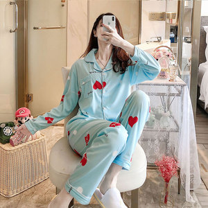 春秋季睡衣女翻领长袖长裤韩版甜美爱心薄款休闲家居服套装