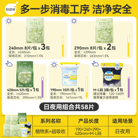 全新倍舒特高端植物系卫生巾,采用高端植物系成分,让姐妹们用起来更加安心,舒心,放心!! 1套:标价159-官方立减30-商品券40 最多8包70片(240mm*3包+290mm*2包+420mm*2包+155mm*1包)