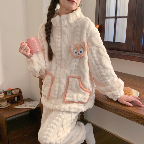 秋冬季新款睡衣女珊瑚绒法兰绒拉链款加厚立领甜美风家居服套装