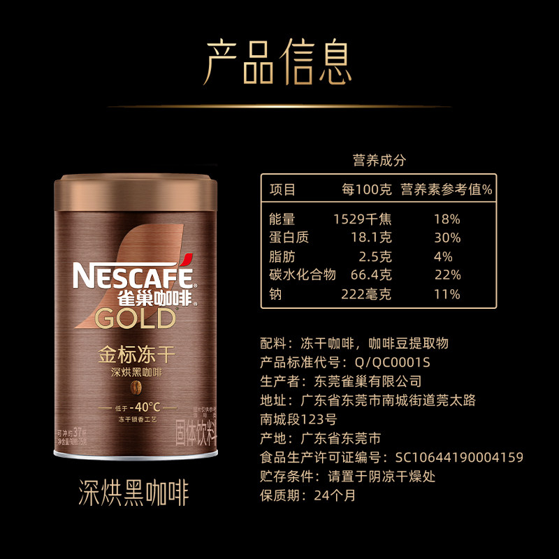 雀巢咖啡金牌深度烘焙低温冻干速溶黑咖啡75g即溶健身提神