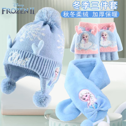 迪士尼冰雪奇缘爱莎公主帽子围巾手套针织毛线加绒套头帽子保暖套