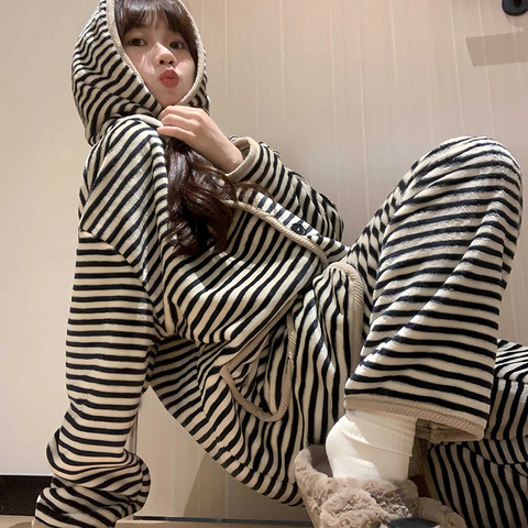 2026新年红可爱小熊半边绒睡衣女冬季条纹加绒加厚珊瑚绒家居服ak