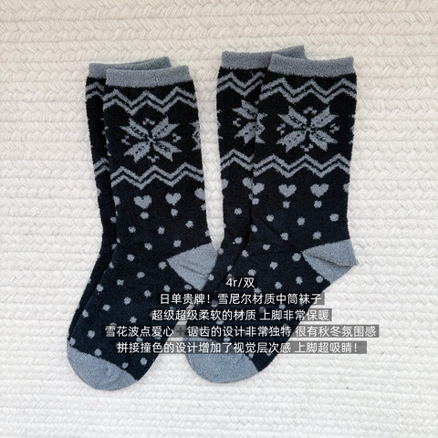 39包邮/超柔雪尼尔!日单加绒保暖雪花波点爱心中筒棉袜子