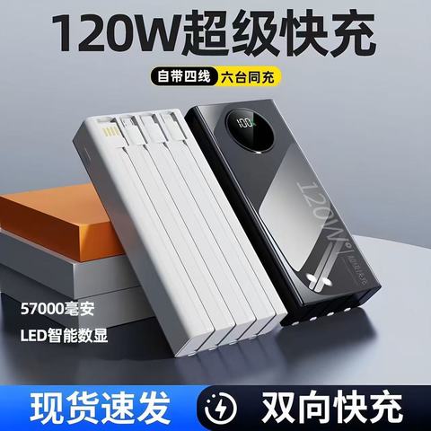 【3C认证】大容量充电宝57000毫安120W超级快充自带4线移动电源