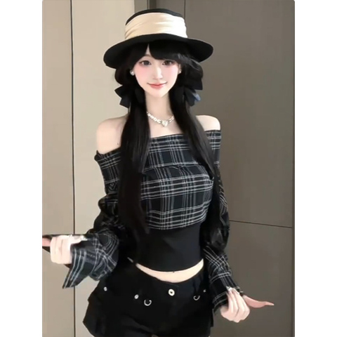 2025早秋季新款慵懒风简约黑白撞色格纹设计一字肩收腰长袖上衣女