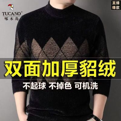 啄木鸟冬季加厚貂绒毛衣男中青年半高领宽松针织打底弹力保暖毛衣