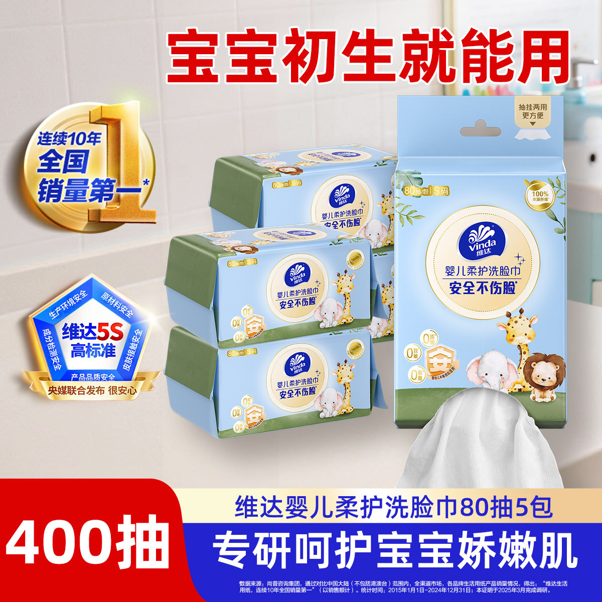 维达 一次性抽取悬挂洗脸巾新生婴儿宝宝专用80抽包擦脸巾安全温和