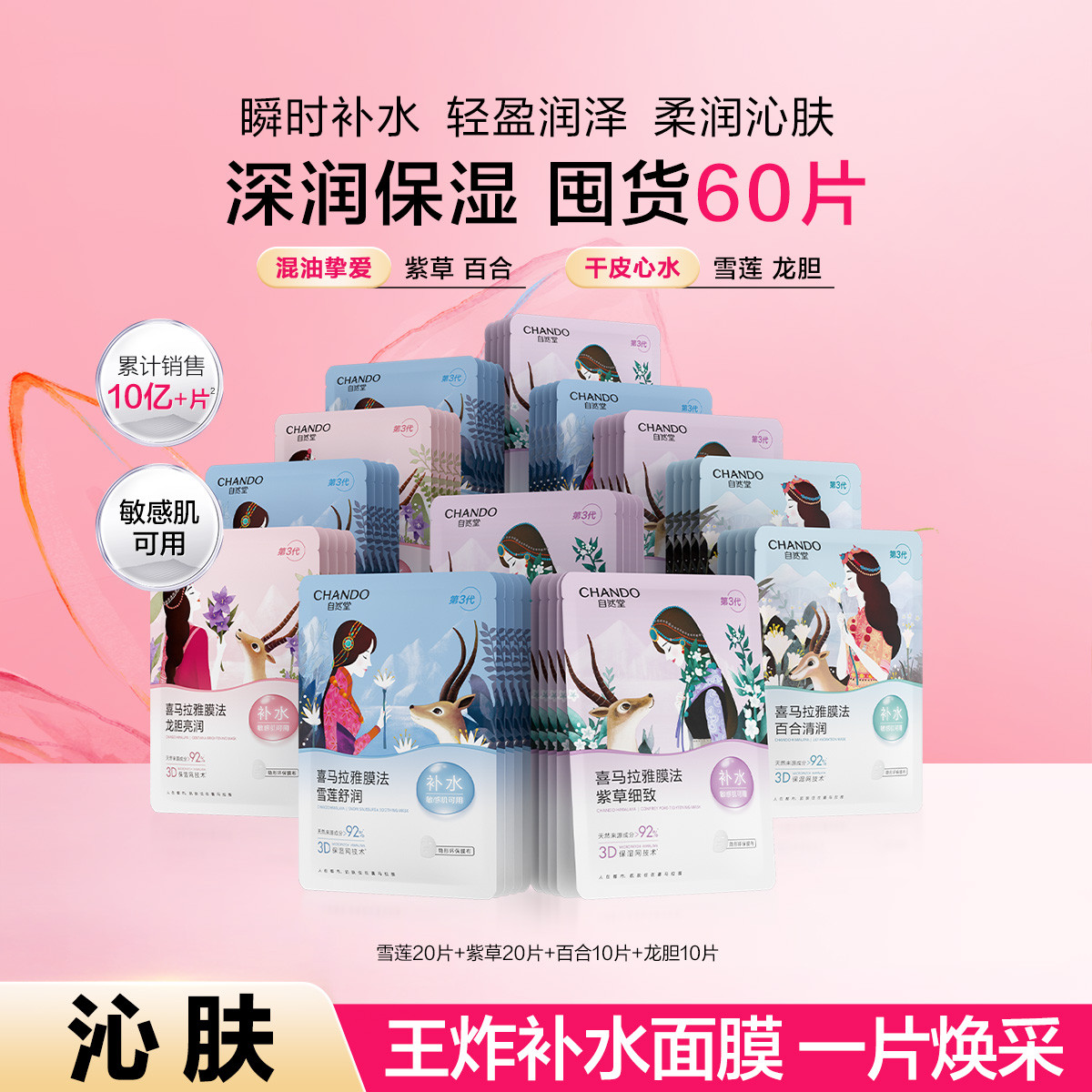 自然堂 【直播惊喜】植物补水面膜60片囤货装锁水适敏温和深润补水保湿